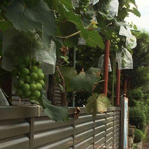 2017.8.22 ひまわり通りの一軒。 フェンスとサッシの間1メートルくらいの場所でブドウの栽培。これは達人技?