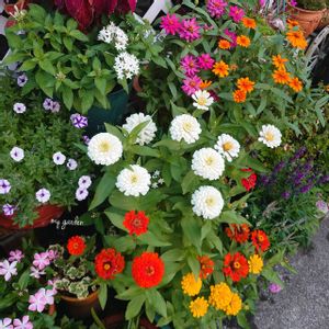 鉢植えのコーナーを上から撮ってみました(•‿•) 統一感は全然ない色とりどりのコーナーだけど私はお気に入りです(◕ᴗ◕✿)✨ 夏のお花ではジニアが大好きで沢山のジニアがあります✾