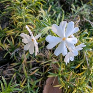 シバザクラが白い花を咲かせています。 シバザクラと言えば、春に咲くのですが、 季節外れでちらほらと咲いています。 やはり春はたくさん咲きますが、 それ以外の季節も細々と咲きます。 正直1年中咲いているような感じです。 枝も成長し、緑色が鮮やかです。