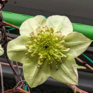 前のお家でクレマチスの花が咲いていました✳️ 高い所だから手を伸ばして撮らしていただいたのですが… 3枚目は我が家の二階から何とか拡大して何とかお花とわかりますか😅