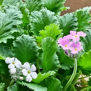 種蒔きっ子のサクラソウ 茎もぴょんと伸びて 可愛いお顔を見せてくれました🩷🤍☘️ たくさん咲いて欲しいなぁ〜🤗