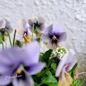 玄関前に置いてたら凍ってしまったので風除室に移動しました❄️ 元気に咲いてます🤗💜🤍🩷☘️