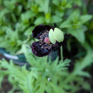 おはようございます✨ ポピーブラックマジックが咲きました🖤 なんと、見つけたときは、蕾の周りのカバー(正式名わかりません😅)が花びらの上に乗っかっていました 2枚目はお花をアップで📸 種蒔きした時は、野良猫(多分)にひっくり返されてしまい手で土をすくい上げて救出したので、ひときわ嬉しいです 3.4枚目はヒューケラ お花が咲きそうです 5枚目は斑入りホスタです