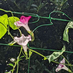 西洋朝顔のジャーマンピンクです。 去年のから種を取って適当に撒いたら、少し柄が違うお花も咲きました。何故か真っ白の子もいて面白いです👍 この種類は庭に植えたらびっくりするくらい大きくなります。 去年それで懲りて、今年は大き目にネットを貼ったら、ネットには少ししか絡まず、奥の木と近くにあった鉄柱に伸びてしまいました😰 なので写真が取り辛いし、片付けも大変そうで、また今年も苦労しそうです😅