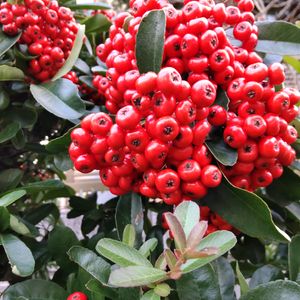 今日のお花 「ピラカンサ」 周りの木々の葉が散る中、青々とした葉に紅い実がびっしりにつき、美しいです。 ②枚目は11月半ばの色づき始めた頃です。