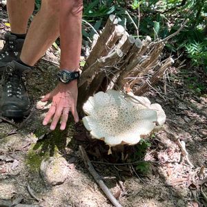🍄シロオニタケ🍄 すずはなさんとドラえもんさんに教えて頂きました🙏 どうもありがとうございます😊🍄 大きいのは 私の手をガボッとして少し大きいくらいでした。 雨の日なので触らずでしたが… 丼の大きい位の傘でした。 こんな大きなのは初めて🔰 7/19 追加 ・毒キノコに分類されている🍄☠️ ・傘は5~30㎝ うんうん直径16㎝位あったよ🎵 ・傘の表面にブツブツは激しい雨で脱落しやすい…うんうん 大きいのはブツブツなくてツルン❓プニプニ❓ムニムニ❓ ・成長し乾燥すると悪臭を放つとか。この日は雨で☂️分からず😊 ありがとうございました😊🎶💓