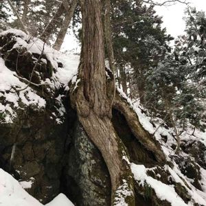 おはようございます☁️ 津軽おのえ温泉福家 玄関先に水琴窟 水に写された木々 優しい水音に癒されました