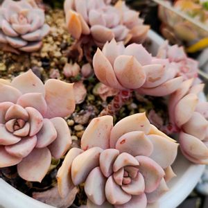 こんにちは😄 今日も朝から蒸し蒸しと暑い1日でした🥵 今日も天気予報はハズレて午前中はカンカン照り☀️ お昼に少し降って直ぐ止んでまたカンカン照り☀️ 夕方に少し降って蒸し蒸しさがアップ🥵 今夜はかなり寝苦しそうになりそうです😮💨 今日は久しぶりに多肉丼🎵 朧月、 お友達のJUSHIちゃんに頂いた子🩷 良い色になってきてます🎵 朧月って初めて育ててるのですが今時期に紅葉する子なんですかね〜🥰 キュート、 葉挿し率は100%なくらいめちゃくちゃ増えまくる子だけど、うちの子はめちゃくちゃ成長遅い🤣 七福神、 毎日直射日光当たったますが蒸れずに元気でいてくれてます😊 このまま夏を乗りきってくれると良いな〜🥰 ピンクローサ、 梅雨前に少し弱ったけれど何もしてないけど今は何故か元気いっぱいだわ😂 姫秋麗、 大きな丼にすると何故かあまり増えてくれない🤣 姫秋麗畑もまた撮らなければです😅 うちの多肉丼は思ってたより成長はしてくれてないけど元気なので良いかな😅 私はやっぱり丼での育成は向かないのかも知れません🤣