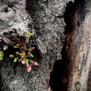 桜 違う目線で。 いつも通る桜並木。 いつもここで開花を 確認していたのに なんでだろ、 今年 全然通ってなかった。 あれ? 結構咲いてるね。 しかも 老木だったんだ。 いつも 花ばかりを 見ていたんだろうか……。 こんなに朽ちているのに こんなにも健気に。 いじらしい……。