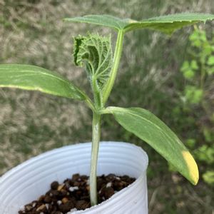 2024.05.03 病気? キュウリの茎が一部分だけ細い 葉もクルンと曲がっている 病気かもしれないので種子を蒔き直します
