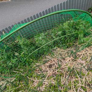 野菜遺産の美笹豌豆 やっと伸びてきたら鳥に新芽を食べられ🐦⬛🤣 ダイソーの網をかけてます 細い細い玉ねぎもちょっとだけ太くなってきてます🌱🧅