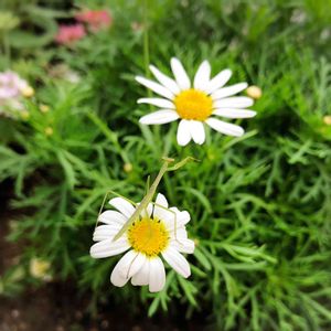 マーガレットとちびカマキリ🍀 今日もいました🙌🏻 4歳の長男と喜んで観察していたら 2人とも蚊にくわれました😅 息子がとっても喜ぶので このまま住み着いてくれるといいな✨ ちなみにこのマーガレットは 3年以上前に植えたものが 生き延びているのか、 こぼれ種で更新しているのか、 毎年咲いています🌼 とても丈夫な子で現在はこの子の こぼれ種で育ったらしき子が10株あります😳