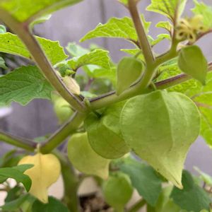 食用ホオズキ(鬼灯) 藻岩山の麓に住む友人が、毎年苗を届け でくれる。 甘く、程よい酸味はジャムや、ゼリー、 料理の付け合わせに。 食用ホオズキ(鬼灯) ナス科 ホオズキ属 草丈 30〜1m 葉 互生 長さ6cm 幅5cm 花 クリーム色 径2cm 口がラッパ状に開く。 中心部は紫褐色。 (右上の小さいのが花) 果実 3cm位 緑から黄色になる。黄色になると 食べられる。(左下)