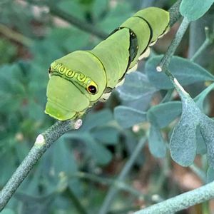 ルー(ハーブ🌿)とナミアゲハ蝶の幼虫 「寒くなりましたよ。葉っぱも無いし、 大丈夫ですか?」 ルーの枝にまだ4匹頑張っています。