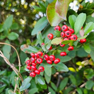 今日のお花 ピラカンサ バラ科トキワサンザシ属 今は使っていない球場の周囲の緑地帯に混ざって赤い実がよく目立っていた 鳥が近くにある住宅街の生け垣の実を食べて種子を散布するものと思われた 果実の先端には黒く萼片が残っていて わたしはピラカンサですといってるようだ