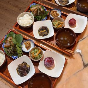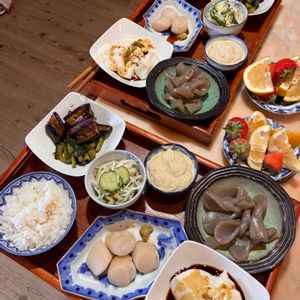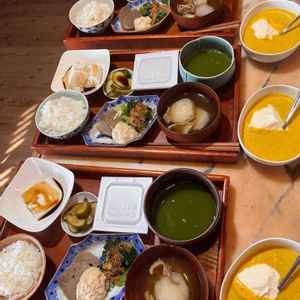 朝ごはん 炊き立てお焦げご飯 味噌汁 里芋、舞茸 落花生豆腐 芋蒟蒻、ぬた 小松菜、胡麻和え 納豆 カボチャのポタージュ、 生クリーム添え キューリ糠漬け