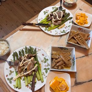お昼ご飯 お焦げご飯 グリーンアスパラガス 塩漬け豚バラ肉 淡竹、揚げ煮物 アップルマンゴー グリーンアスパラガスが娘から届いた。 早速塩漬け豚バラ肉を焼いたその汁をかけマヨネーズもかけて、ふんだんに頂く。