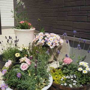 玄関前の初夏バージョン。 備忘録として全景を。 バランスが、難しいですね。 でも大好きなミニバラとラベンダー3種に癒されます🎵