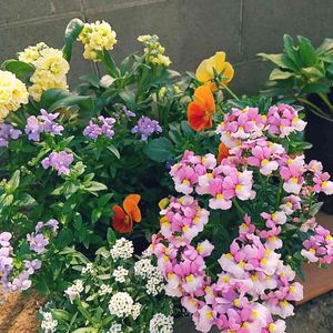 春の寄せ植え、その3 種まきっ子の3姉妹。ちょっとぎゅうぎゅうだけど、混じりあっていい具合に咲いているので、このまま育ててます。もうそろそろ切り戻そうかな。