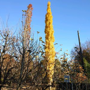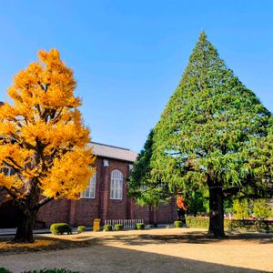 左のイチョウはすっかり葉を落としとんですけど、右のはご覧のとおり、真っ黄色💛💛💛 不思議ですねぇ🙄🤔 それにしても、体脂肪率0%のスリムなイチョウです🤭(農業試験場内にて)