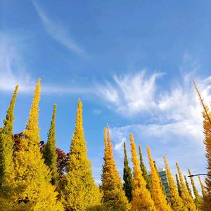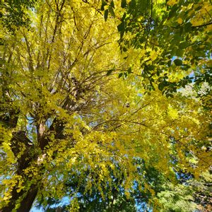 【1枚目】 天を衝く🙄 メタセコイアっぽいですね🤔 空に映える紅葉です🤩 【2枚目】 西側は黄、東側は緑😲 やっぱり日のあたりかたなんですかね。いましか見られないツートンカラーのイチョウ並木です🤩 (いずれも農業試験場内にて)
