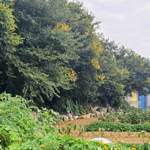 榎木の黄葉 家庭菜園を囲む樹に黄色い塊 花にしては不思議だし・・・ 近づいて確認したら、黄葉の始まりだ った。 毎年、こんなふうに黄葉が進んでたの かな。
