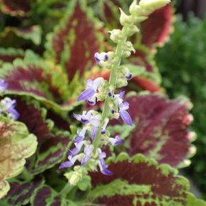 【No262 コリウス】 花よりも葉を楽しむコリウスですが、花も可愛い💕です💕一本だけ伸びた花茎に、唇💋形の花が穂状に咲きます。花が咲くと葉があせてくるので、花は咲かせない、ことも多いでしょうけど。 名前はギリシア語の「koleos(さや)」が語源。刀のさやに似ているとか、花のおしべ同士がくっついていてさやのように見えるからだそうです。 種類は100以上あります。シソに似て鮮やかな斑があるので「錦紫蘇(ニシキジソ)」とか「金襴紫蘇(キンランジソ)とか呼ばれます。 花言葉「健康」は、一年中綺麗な葉っぱを見せてくれるから。 「かなわぬ恋」は、花が咲くと葉っぱの色があせてくるから。または、葉の豪華さに負けてしまう花の様子から。 「恋の望み」「善良な家風」もあります。 あまりお世話がいらないですが、楽しませてくれる花です。