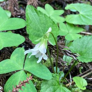 タカオスミレの母種、ヒカゲスミレです。 文字通り日陰が好きなスミレ。高尾山ではヒカゲスミレとタカオスミレが至近距離で咲いていて、葉が緑色とも茶色とも、どっちつかずな物も見られますが、残念なタカオスミレとでも呼んでおきましょうか?3/30高尾山 メモ📝 ▪️花色は白く、唇弁と側弁に紫条が細かく枝分かれして目立つ ▪️花弁は波うつ ▪️花柄、葉柄など全体に毛が多い ▪️側弁基部は有毛または無毛 ▪️葉は卵形で、基部は湾入する