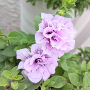 ペチュニア パニエのラベンダー 咲き始めは純白なホワイト だんだんパープルがのってくる 株が大きく広がって、だんだんつぼみもついてきて、今一斉に咲き出した パニエはブルーのほうが花が大きく、八重の形も違う どちらも這い性だけど広がり方も個性あり