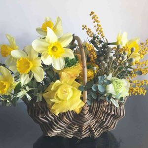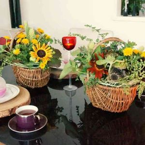 向日葵のパニエアレンジ 素敵なサロンでのレッスンに緊張しながら、ミスカンサスを編み編み (*_*; 姫ひまわりに高低差をつけてナチュラル感を表現 青りんご可愛い〜♡ ゆらゆら揺れるアジアンタムが涼しげで今日も満足満足〜♬