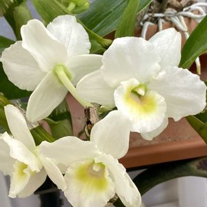 昨年の9月29日に我が家に来たミディ胡蝶蘭ファーストラブのふぁ〜ちゃんが咲き始めました😆💕💕 なんてかわいいの💕 白くたおやかなお花に癒されます🥰 でも‼️ 今日は大切なお休みなので癒されている場合ではない😆💦 胡蝶蘭とバンダ以外の蘭の大半をお外の棚に移し、今年植え替え予定の28鉢を全て植え替え終了😆✨✨ 頑張った‼️ 買ったままポット植えのや水栽培のいくつかを素焼き鉢&水苔植えに 根腐れ気味の株は消毒には泡ハイターがいいと教えてもらったのでシュパシュパかけて良く流し、乾かしてから植え付け予定 流石に疲れました😅