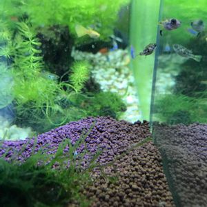 やっと、白い石と青い石を入れることができました。 小さな濾過器を入れたので、苔のところに水が流れています。 有茎の水草、成長が早くて、植えた時の3倍以上背が高くなっています。