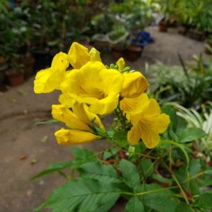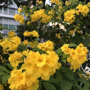 シンガポールで、夏に咲いている黄色いお花です、花びらは五枚のように見える切り込みがあり、後ろは朝顔のようなラッパ型です、のうぜんかずらみたいですが、よくわかりません😰よろしくお願いいたしますm(_ _)m🙏