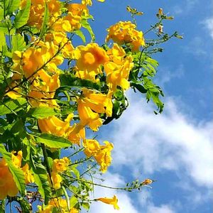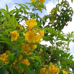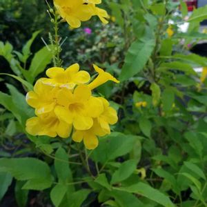 9月❷❼【金鈴樹】*浦添市牧港 みーさん、ありがとうございます…✍🏻 *常緑小高木 *ノウセンカズラ科テコマ属 *花言葉…陽気 雨でどんよりした日でも、明るく元気にしてくれる花。金鈴って呼ばれているように、音色が聞こえてきそうな花姿ですね〜✨ 2019.9.18 pm 13:05 ☔️