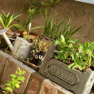 リサイクル花壇 穴が空いてたブリキのジョーロ 穴が空いたブリキのバケツ 壊れたポスト 皆んな可愛いく活躍中!!