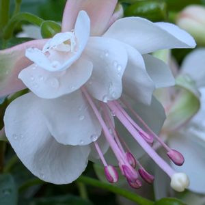 🏷️白い水曜日♡ 🏷️水滴の水曜日 参加します 庭の白い花たちです 昨夜の雨でしっとりと ①フクシア ②八重ドクダミ ③ブライダルシャワ- ④ツルコザクラ ⑤ユキノシタ ドクダミ花小さくなって しまった 根切り虫にやられた ブライダルシャワーは なぜか株半分には 花が咲き、あと半分には 花芽もない💦 なんかね、まともに育って くれるだろうか? 生き残っただけまし😰 あっと言う間に梅雨がくるみんな頑張れ‼️ 庭の白い花たち