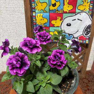 ペチュニア フラメンコブルーベリー お迎えしたばかりで雨が降り☔ 室内に置いています。 スヌーピーちゃんとコラボして、可愛いですね💜 🏷️ 毎月2日はスヌーピーの日に参加します。 遅れましたが、今月も宜しくお願いします🙇