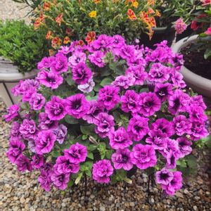 ペチュニア フラメンコ ブルーベリー 満開に近くなってきました🎵色味の深さが抜群です🌼お花も大きいので存在感あります。 暑さにも雨にもとっても強い八重のペチュニアです。株幅40cm,花経4.5cm(6月は5~7cm)