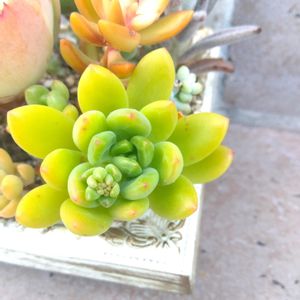 2024.10.1 3月に寄せた子の夏明けの顔です。 一見元気ですが、 熊童子、子猫の爪、ファンタジー、ロゲルシーはいなくなっていました😭 土が浅いのと猛暑とで、暴れるまではいかず、意外と品よくまとまってます。