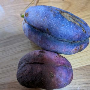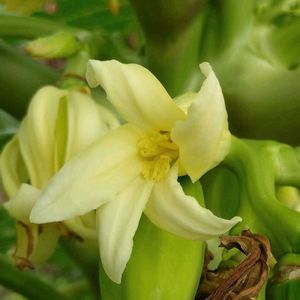 パパイヤ パパイヤ科パパイヤ属の常緑小高木。熱帯アメリカ原産で、世界各地の熱帯、亜熱帯地方で植栽される。16世紀、スペイン人によってカリブ海沿岸に伝わり、日本には明治時代に渡来した。樹高10m。葉は幹の上部に束生。6〜11片に深裂、葉柄は長い。花は白色で5花弁。花には雌性、雄性、間性の分離がある。雄花は葉腋に出た穂状花序に多数つき、雌花は単生または散房状につく。 果実は球形、洋梨形、紡錘形など多様。青い未熟果を野菜として利用する。切って水に晒しアク抜きをして種子を取り除いてから用いる。パパインというタンパク質分解酵素が含まれ、肉と煮ると肉が柔らかくなる。チャンプルーやサラダ、漬物、イリチー(炒め煮)などにする。完熟したものは果実として利用される。熟すにつれ黄〜黄橙色となる。果肉は黄〜黄褐色系と橙赤色系の2様がある。多汁で甘く香りがある。 日本では、瓜に似ていることから木瓜(モクカ)と呼ばれることもある。茎や葉、果実に乳液が多く含まれているため乳瓜(チチウリ)とも呼ばれる。 出典『食材図典』『図説 果物の大図鑑』『フルーツひとつばなし』『薬草の呟き』