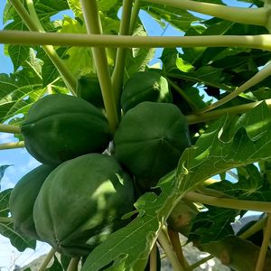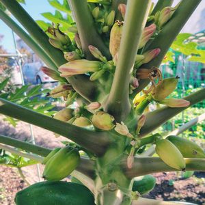 パパイヤ 見たことありますか? なかったら スルーして見てね ツルになってる? さぁ~どうかなぁ 私も初めて見に行きました 鈴なりになってる🤩 葉っぱ、デカい! 花やっと見つけた 大きいビニールハウスの中 大きい木になってました 黄色い💛は、もう少し追熟してから食べようか 緑色は 青パパイヤお料理に