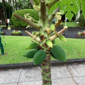 常磐線沿線の畑にパパイヤの木が3本植えてあり、花が咲いているものもあれば実がなっているのもあった。
