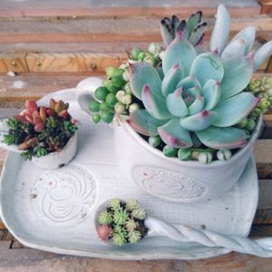 疲れたぁと思いながらも、リサイクルショップで買ってたコーヒー3点セットに寄せ植え🎶✨ 大好きな桃太郎をmainに斑入りグリネ、斑入りタイトゴメ、兎さん💗 ミルク入れとスプーンはセダムさんで…♥