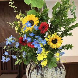 渋谷 聖ヶ丘教会 礼拝堂 今日の装花。 「ヒマワリ」と「キク」の競演。