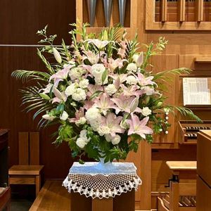渋谷 聖ヶ丘教会 礼拝堂 今日の装花。 ピンク色の「ユリ」と白い「バラ」の融合。
