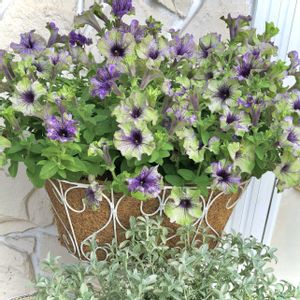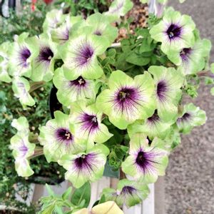 ペチュニア アマゾナス プラムコカトゥー 4月6日(日)にお迎えしました🗓️ 前回の投稿が5月30日(金)📆 前回の投稿後に切り戻しをして鉢増しもしました😅 2階のバルコニーから玄関ポーチに引越しもしました😃 これが原因でストレスになったのか?株が大きくならなかったけど😵💦今週になってからやっと株も大きくなりました😃✌️ 相変わらず生育旺盛で雨にも風にも強く👍️温度にも光線にも今のところ強そうです😁 花色はグリーンが多めのようです😃🎵
