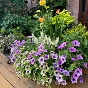 ペチュニアアマゾナスプラムコカトゥは雨や夏に強いお利口な子💜💚6月8日、23日と2週間ちょっとで切り戻して来て今日で2週間くらい経ちました😊 またそろそろ3回目切り戻してみます。 後ろのはディリリーと呼ばれる1日花のヘメロカリス、1日だけど次々お花が上がって来ます💕