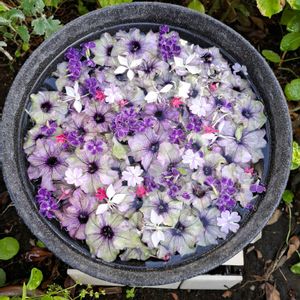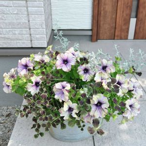 毎日、暑くて🥵 朝はAM4時起きして、お花の手入れをしていますが、終わる頃には滝汗の毎日。 ですが、綺麗に咲いている姿を見ると頑張れます😄 前回の満開からカットして2週間、再び咲き誇ってくれました💕💕🥰 1・タフチュニアのシルバーベリー 2と3枚目 ペチュニア レイシャドウ 4.ペチュニア スーパーチュニア ミニ ピンクとブルー 奥 の黄色🟡は、カスカディアスインディアンサマー 5.ペチュニア アマゾナスプラムコカトュー