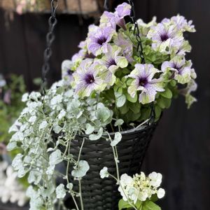 先月作った寄せ植え🌸 もっさもさになっていたので剪定してスッキリ✂️ ダリアは終わり、ペチュニアの天下です💜💚🤍