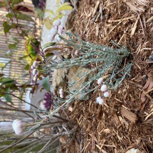 ″ディクラスティリス・グロブフローラ″ 西オーストラリアに分布する、シソ科半耐寒性常緑低木だそうです。 白い🤍綿状のお花がポンポンと、可愛らしいです🥰 1️⃣綿状のお花にお花😳 シベが可愛い😍 2️⃣お花にお花が咲く前は、こんな感じです😊 低木… 大きく…なる…ね😅